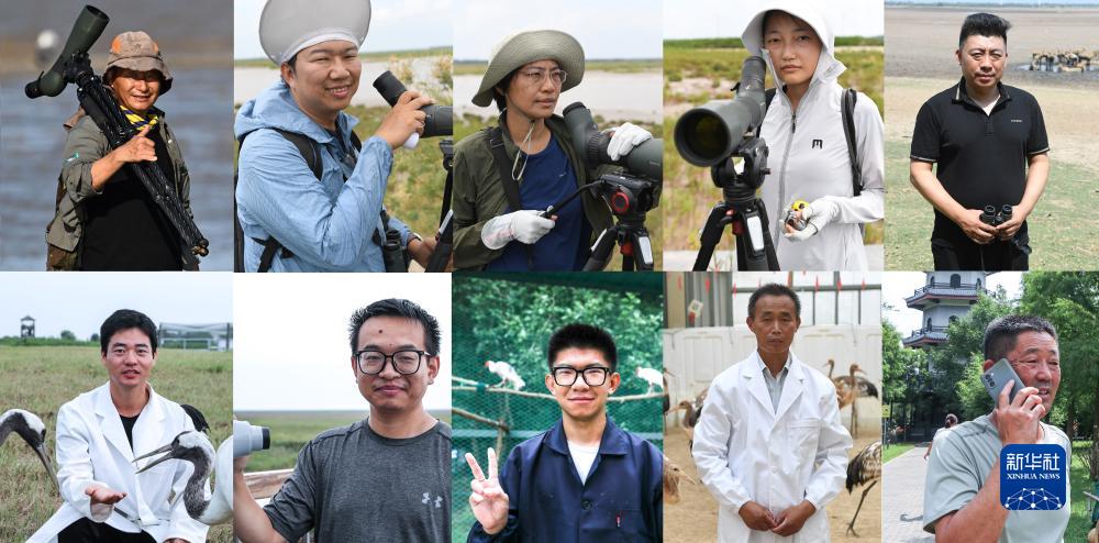 這是一張拼版照片,上排從左至右:東臺條子泥濕地鳥類調查員與攝影師李東明(2023年8月19日,新華社記者季春鵬攝);北京林業大學生態與自然保護學院東亞-澳大利西亞候鳥遷徙研究中心賈亦飛(2023年8月19日,新華社記者季春鵬攝);北京林業大學生態與自然保護學院東亞-澳大利西亞候鳥遷徙研究中心楊洪燕(2023年8月19日,新華社記者季春鵬攝);北京林業大學生態與自然保護學院東亞-澳大利西亞候鳥遷徙研究中心付婷(2023年8月19日,新華社記者季春鵬攝);江蘇大豐麋鹿國家級自然保護區劉彬(2023年8月19日,新華社記者季春鵬攝)。