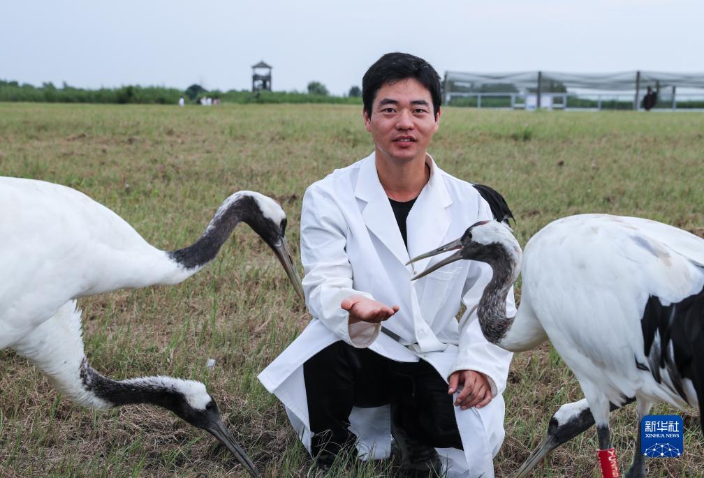 姜官宏在野化訓養丹頂鶴(2023年8月21日攝)。姜官宏在江蘇鹽城國家級珍禽自然保護區管理處下屬鳥類研究中心從事丹頂鶴的人工孵化、人工育雛等工作。截至目前,他和團隊共育成丹頂鶴一百多只。新華社記者 楊磊 攝