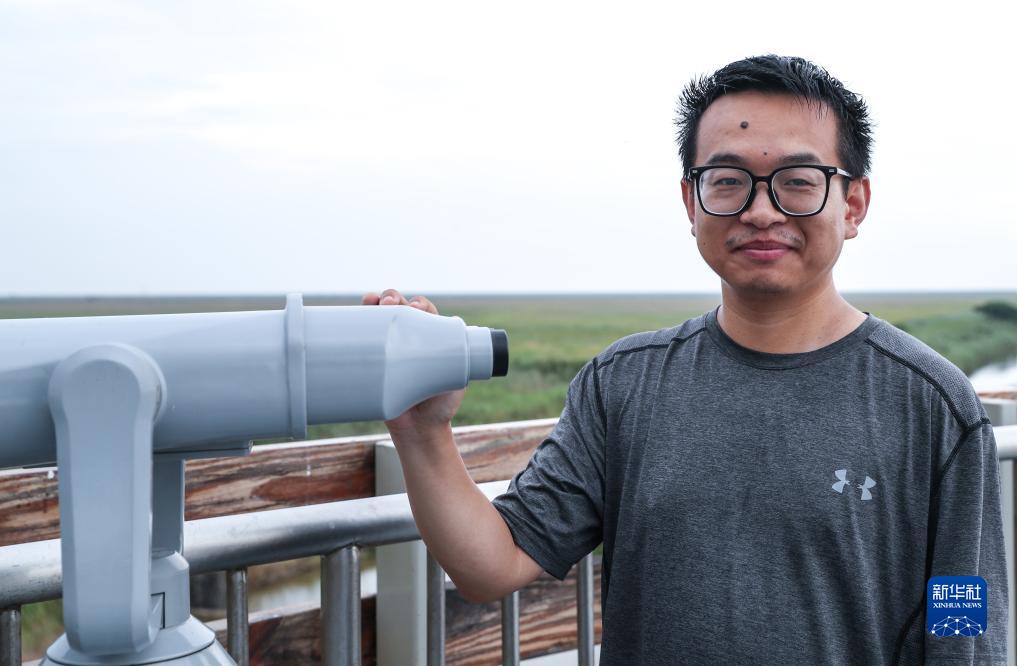 李征浩在觀鳥臺上(2023年8月21日攝)。2018年起,李征浩在江蘇鹽城國家級珍禽自然保護區管理處資源調查與監測科從事濕地生態和生物多樣性監測、退化濕地恢復等工作,鳥類多樣性調查和監測是其中的重要工作內容。“保護區地處偏僻、工作條件艱苦,但是因為熱愛,所以堅持,我一入行就愛上了這個職業,打算一直干下去。”目前,他作為主要發明人獲得授權濕地監測與保護的相關專利已有8項。新華社記者 楊磊 攝