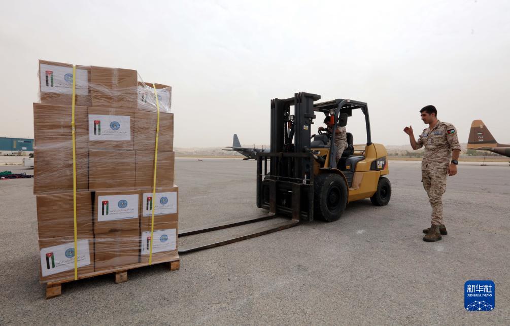 9月13日,工作人員在約旦安曼一軍用機場搬運援助物資。