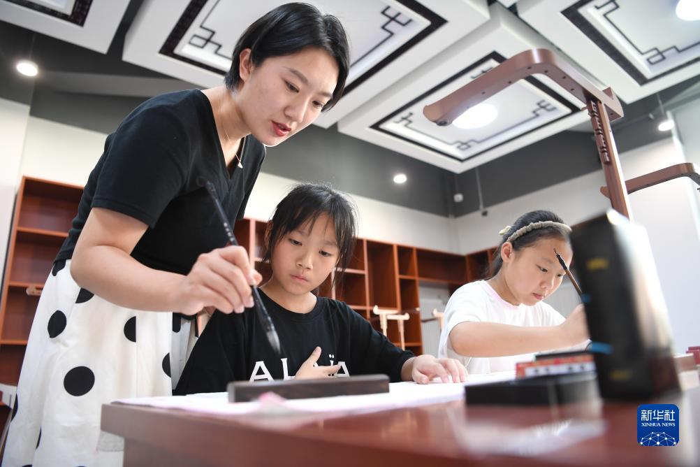 9月13日,雄安史家胡同小學(xué)書法老師指導(dǎo)學(xué)生練習(xí)書法。