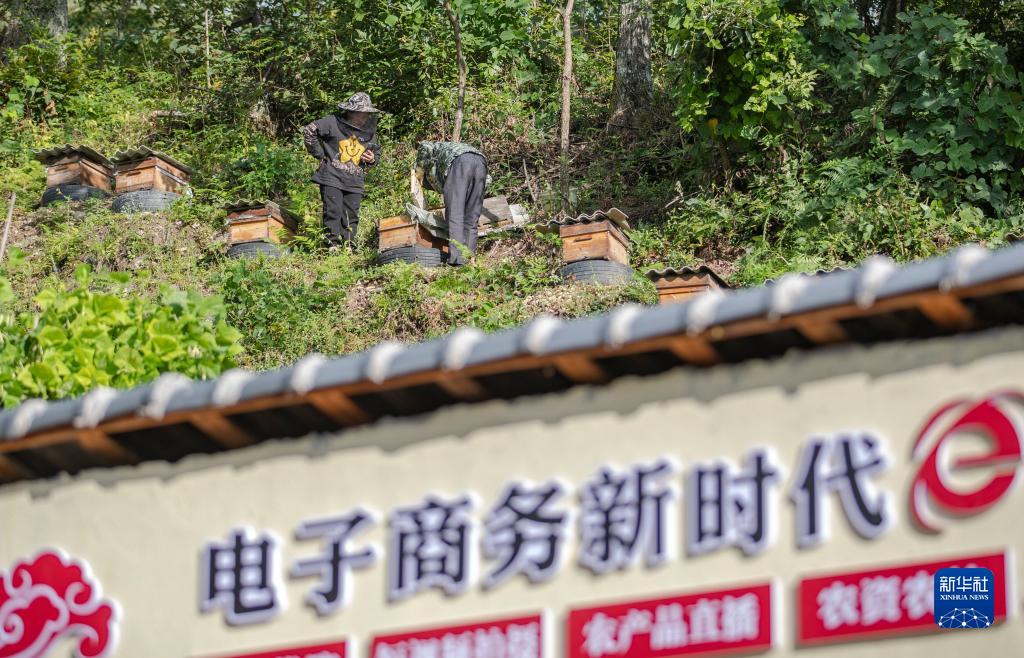 9月13日,在重慶市城口縣巴山鎮農民村,電商主播喻靈芯(左)在直播蜂農采收蜂蜜。