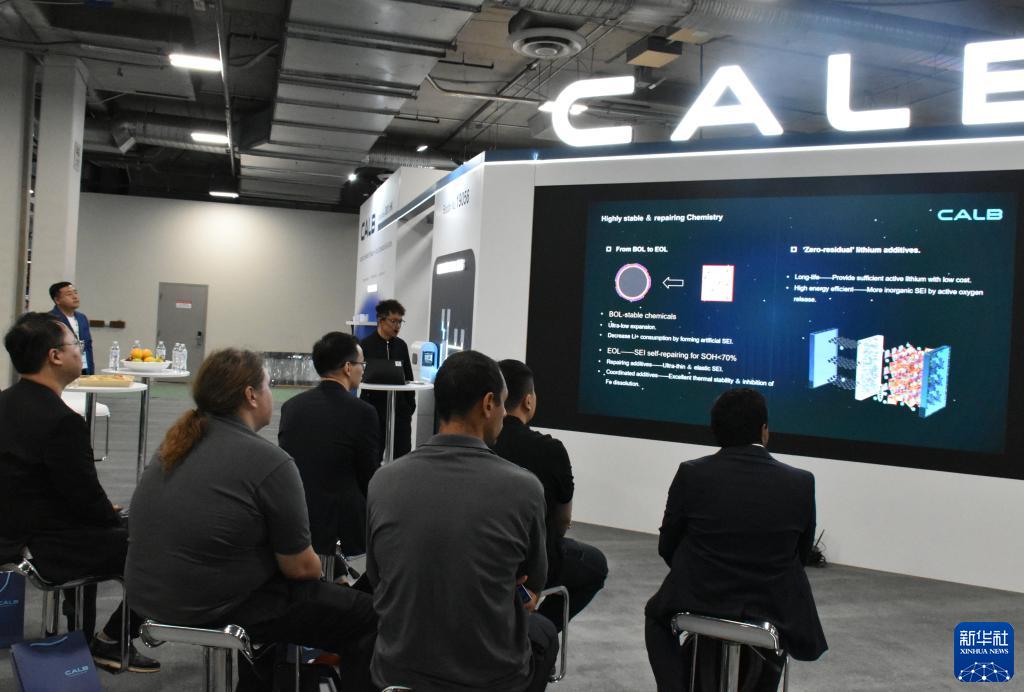 9月12日,在美國拉斯維加斯舉行的北美最大清潔能源展會RE+展會的中國企業中創新航展區,參觀者聽取產品介紹。