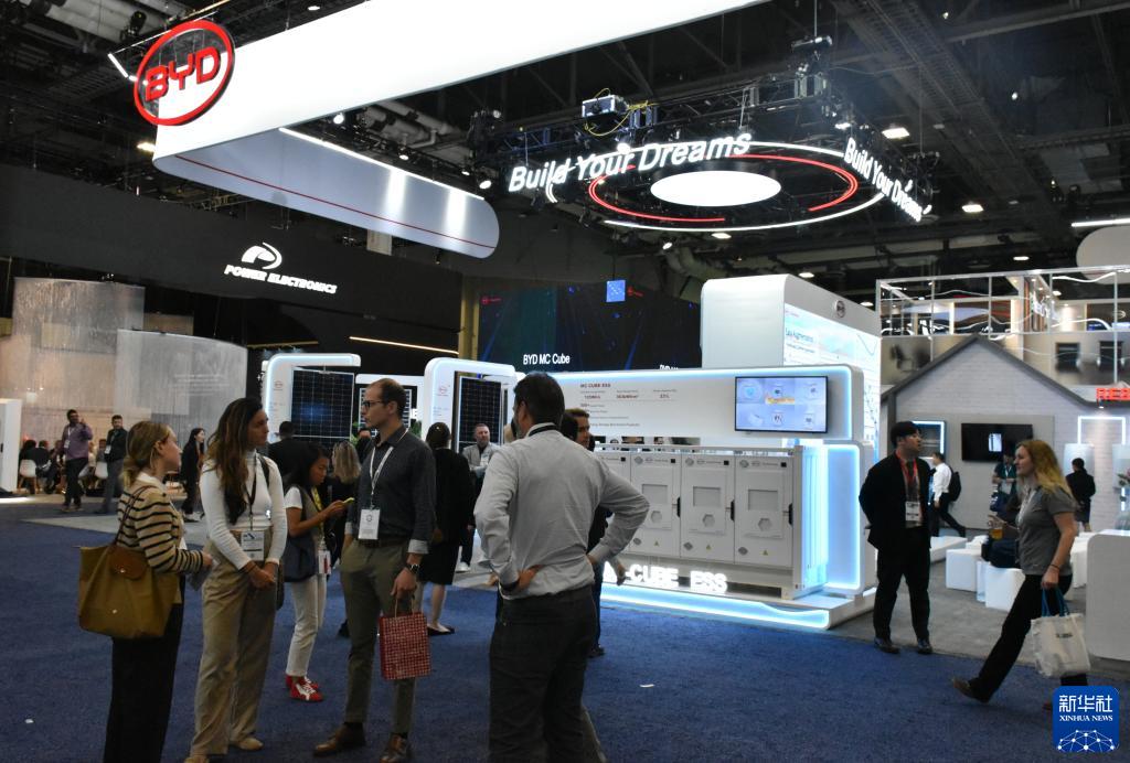 9月12日,人們在美國拉斯維加斯舉行的北美最大清潔能源展會RE+展會上參觀中國企業比亞迪展區。