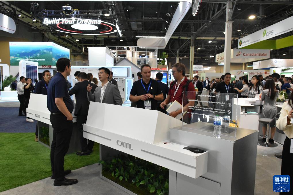 9月12日,人們在美國拉斯維加斯舉行的北美最大清潔能源展會RE+展會上參觀中國企業寧德時代展區。