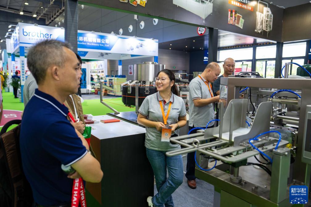9月15日,在長沙國際會展中心,參展商(中)向觀眾介紹食品包裝設備。