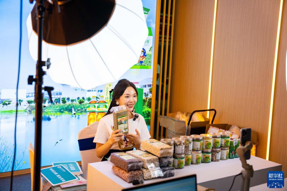 9月15日,在長沙國際會展中心,參展商通過直播推銷雜糧。