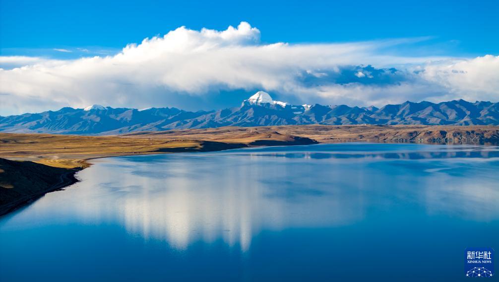 普蘭縣境內的瑪旁雍錯,遠處雪山為岡仁波齊(無人機照片,9月13日攝)。