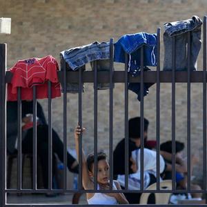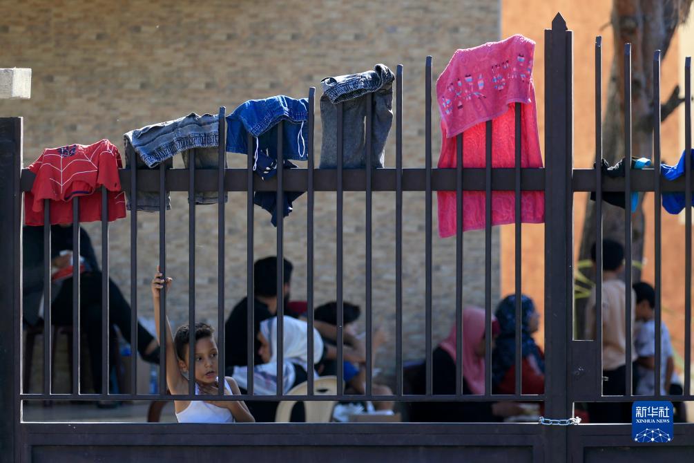 9月14日,一名兒童在黎巴嫩南部城市西頓一處避難所的護欄旁向遠處眺望。