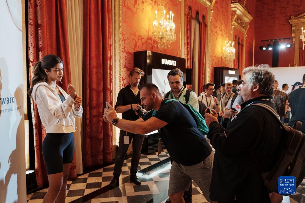 9月14日,在華為西班牙巴塞羅那新品發布會現場,與會者拍攝模特展示的最新穿戴產品。