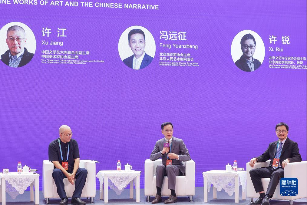 9月15日,北京人民藝術劇院院長馮遠征(中)在“以文化人:文藝價值與社會生活”平行論壇的“文藝精品與中國敘事”圓桌對話現場發言。