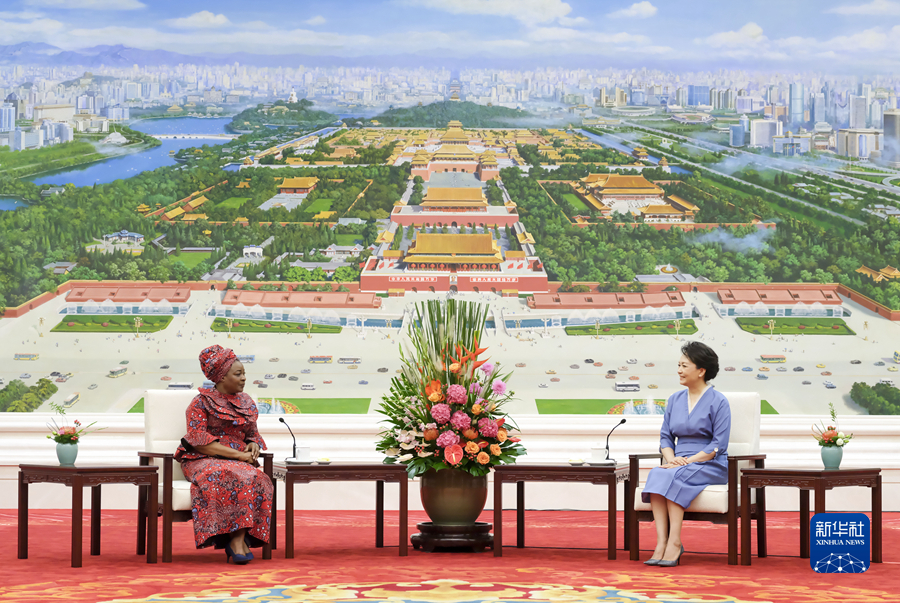 9月15日,國家主席習近平夫人彭麗媛在北京會見陪同贊比亞總統希奇萊馬對中國進行國事訪問的贊比亞總統夫人穆廷塔。