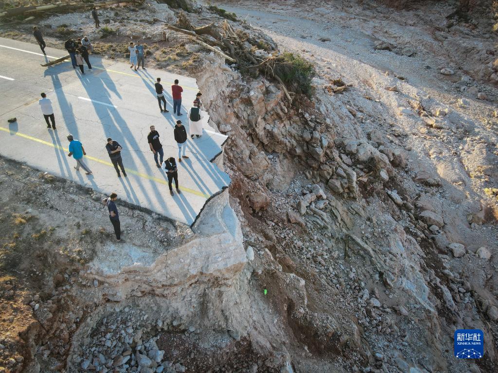 這是9月15日在利比亞東部德爾納附近拍攝的被毀的橋梁(航拍照片)。