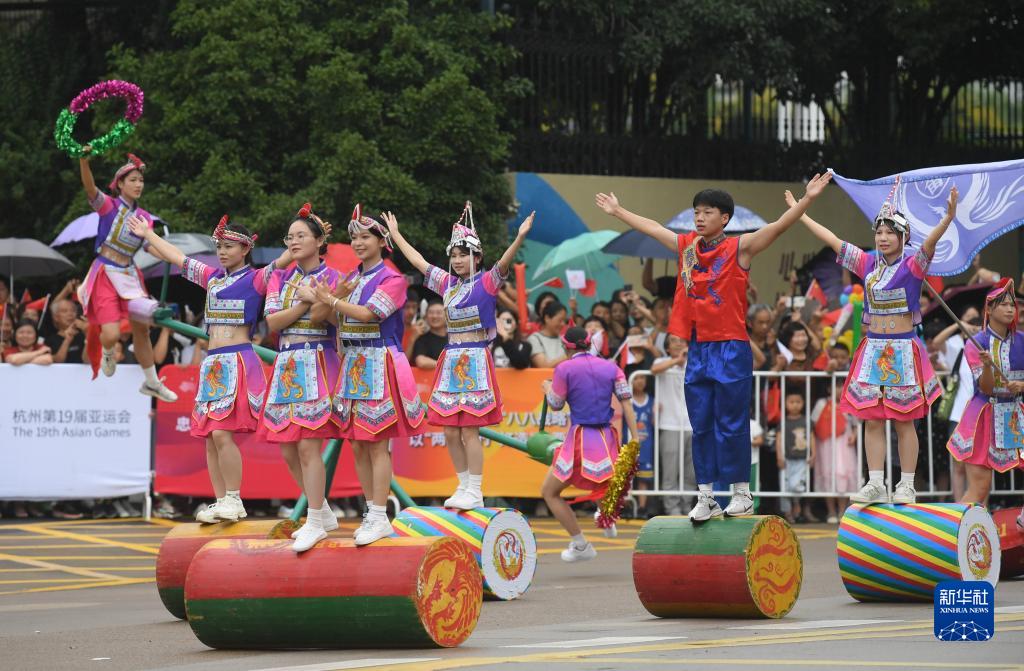 9月16日,身著民族服飾的演員在火炬?zhèn)鬟f沿線表演。