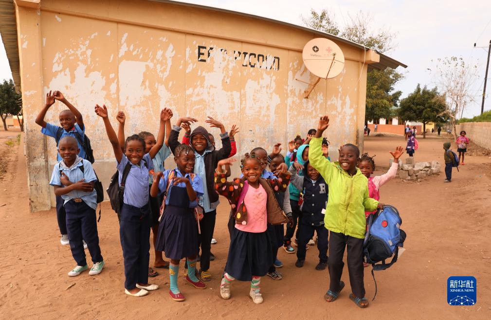 7月25日,莫桑比克馬普托省皮科科村學校的孩子們站在裝有中國援助的衛星電視接收天線的房屋前。