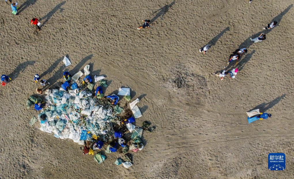 9月16日,志愿者在菲律賓馬尼拉灣舉辦的“國際海岸清理日”活動上清理垃圾(航拍照片)。