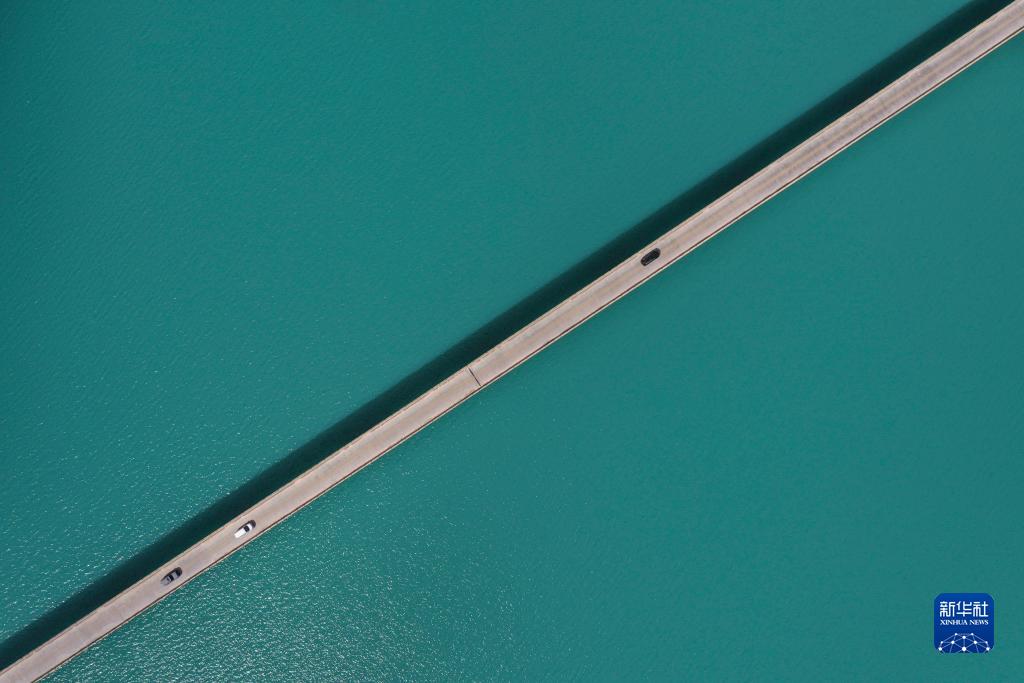 游客駕車穿行在新疆塔什庫爾干塔吉克自治縣“班迪爾藍湖”上方的大橋上(8月28日攝,無人機照片)。