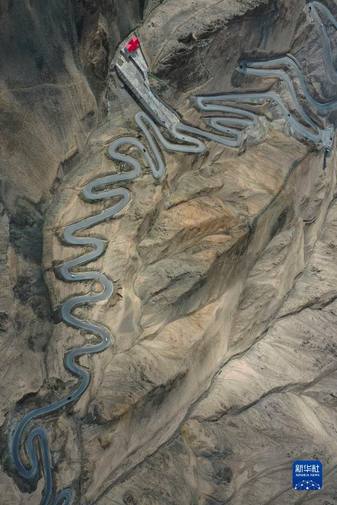 在新疆塔什庫爾干塔吉克自治縣,游客駕車穿行在“盤龍古道”景區(8月27日攝,無人機照片)。