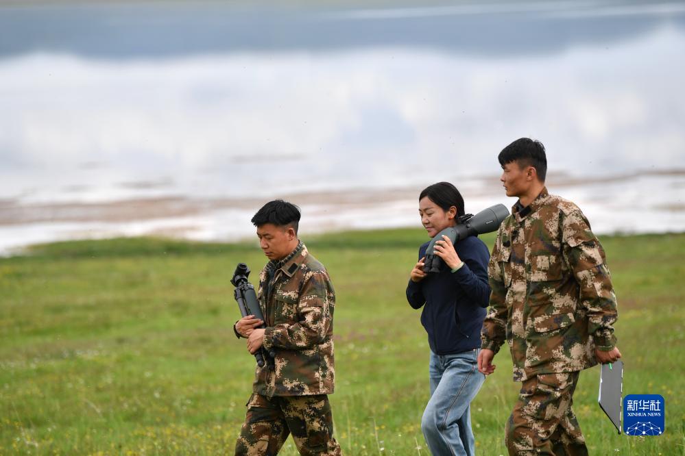 甘肅尕海則岔國家級自然保護區管護中心尕海保護站站長香毛吉(左二)和同事在保護區內巡護(7月7日攝)。
