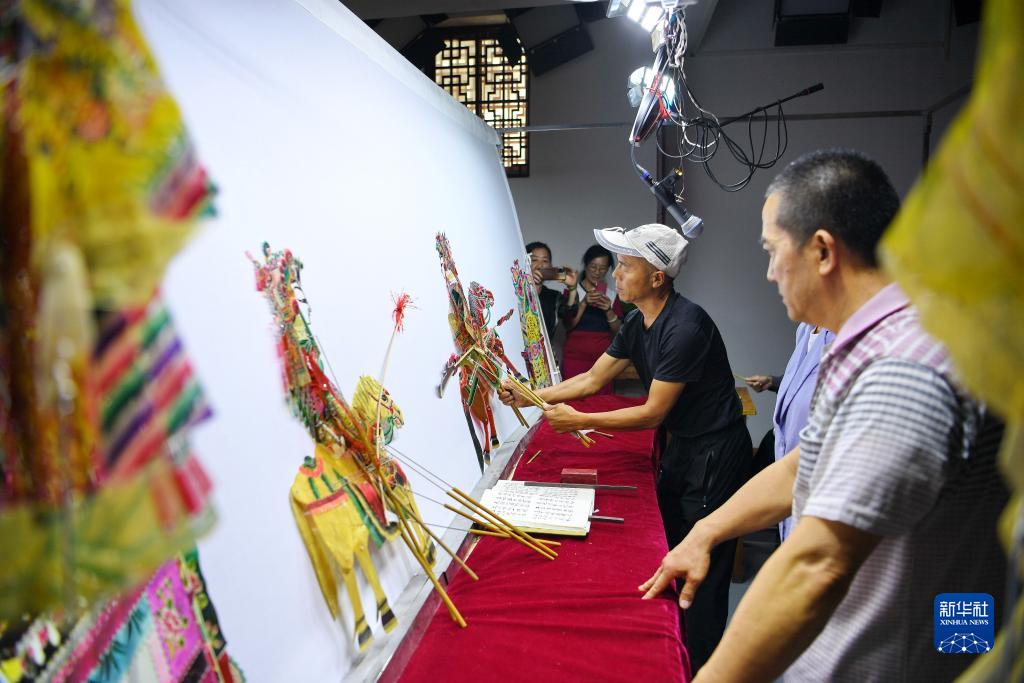 9月16日,皮影戲藝人在玉田縣“非遺會客廳”皮影工坊內(nèi)表演皮影戲。