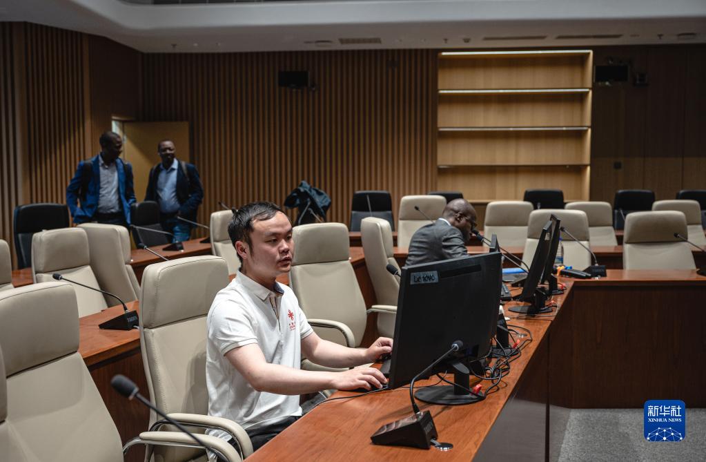 9月11日,中方技術(shù)服務(wù)組組長楊宇杰在埃塞俄比亞首都亞的斯亞貝巴非洲疾控中心總部大樓內(nèi)測(cè)試會(huì)議系統(tǒng)。