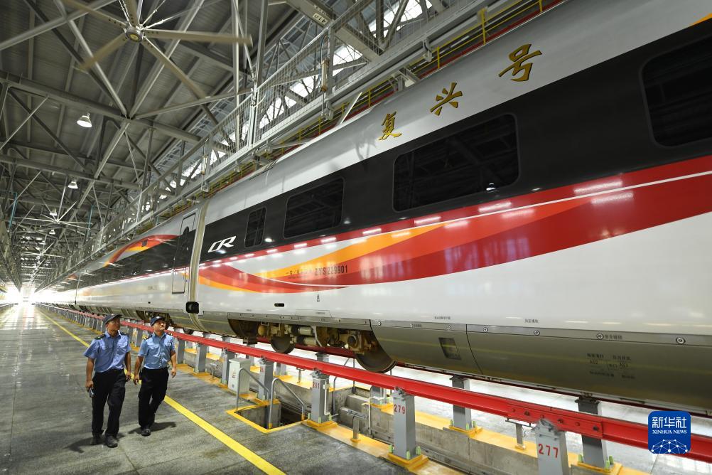 9月13日,在福州南動車組運用二所,高春成(右)和同事對復興號智能配置動車組進行巡檢。