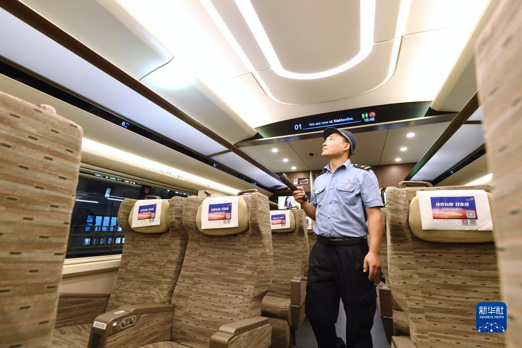 9月13日,高春成在復興號智能配置動車組車廂內檢查。