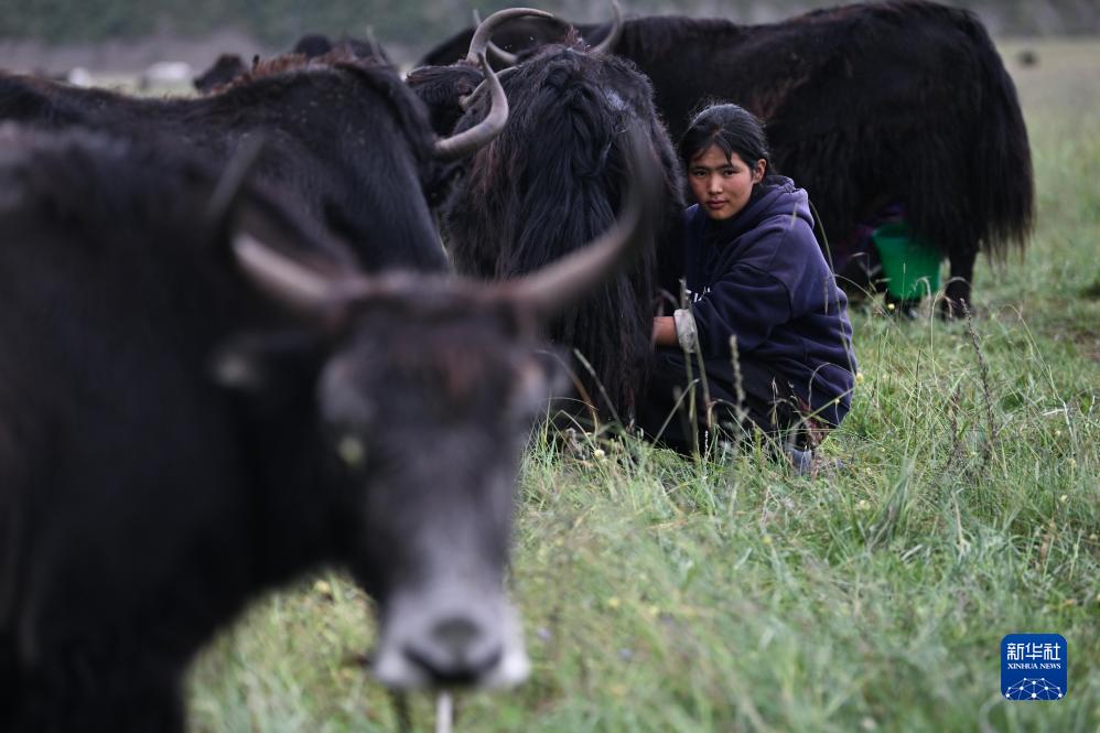 8月17日,在青海省黃南藏族自治州河南蒙古族自治縣多松鄉(xiāng)多松村,扎西曲培的女兒仁青卓瑪在擠牛奶。