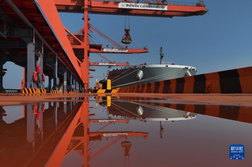 9月16日,一艘輪船靠泊在唐山港曹妃甸港區(qū)礦石碼頭卸載(無人機照片)。