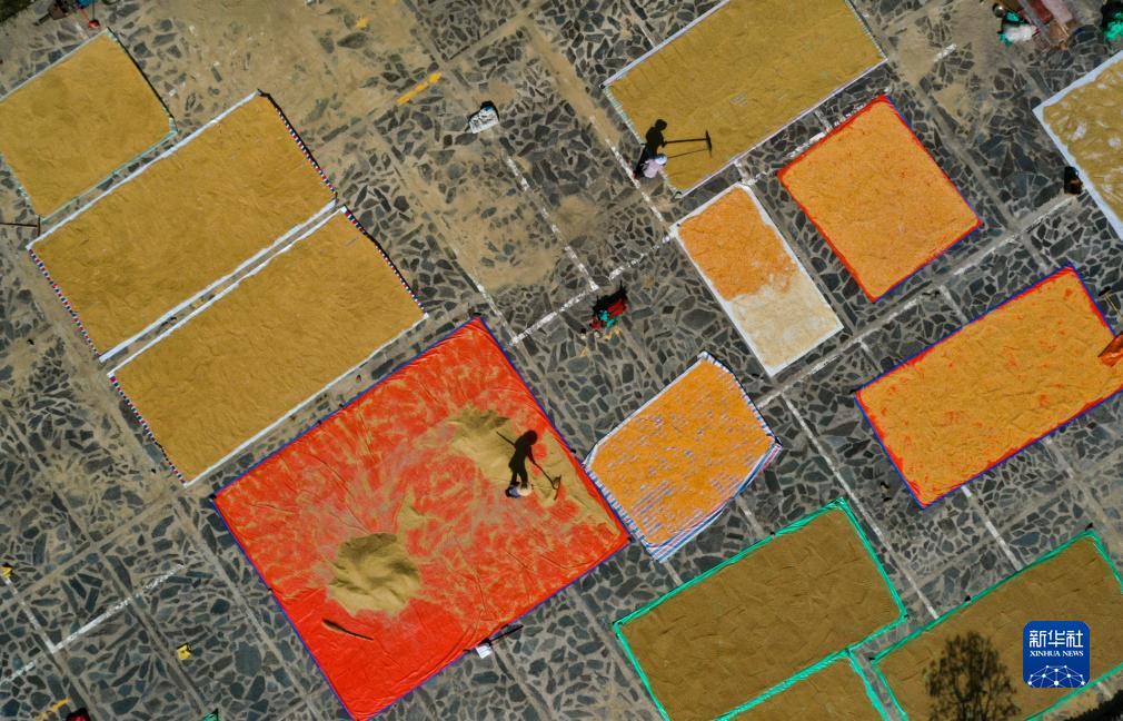 金秋時節,各地農民抓住晴好天氣晾曬收獲的高粱、水稻、玉米等糧食作物,呈現多彩的豐收圖景。