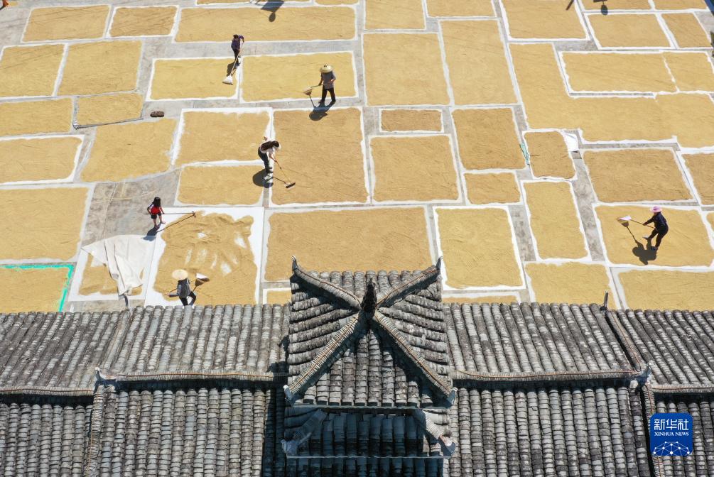 9月16日,村民在貴州省黔東南苗族侗族自治州從江縣剛邊壯族鄉三聯村晾曬稻谷(無人機照片)。