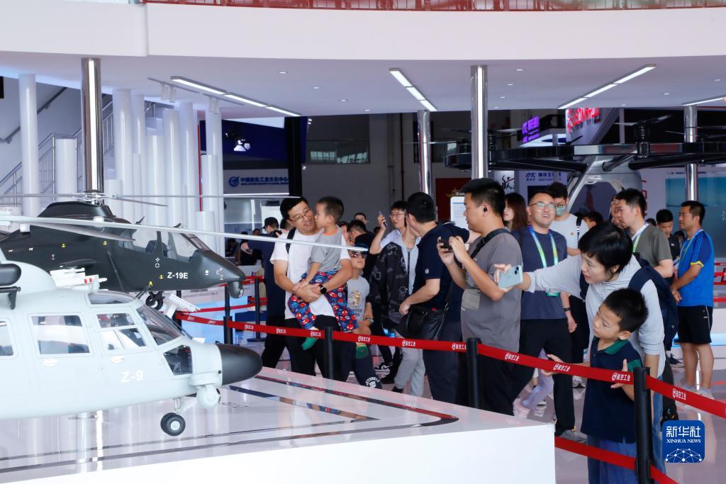 9月16日,觀眾在直升機模型前駐足觀看。