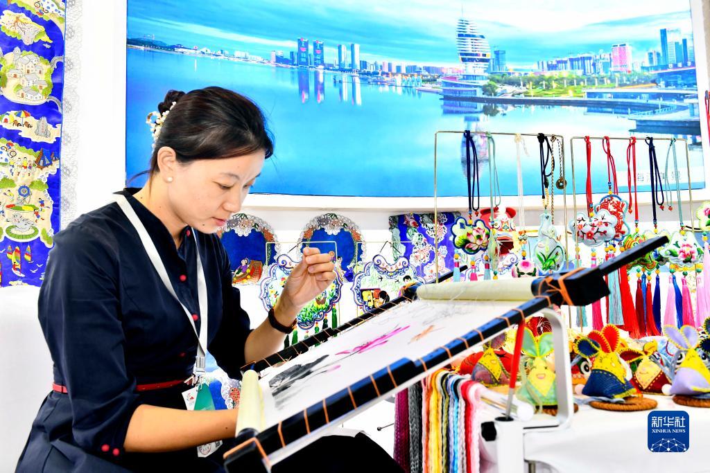9月16日,在山東國際會展中心,日照市刺繡非遺傳承人李兆梅現(xiàn)場展示刺繡技藝。