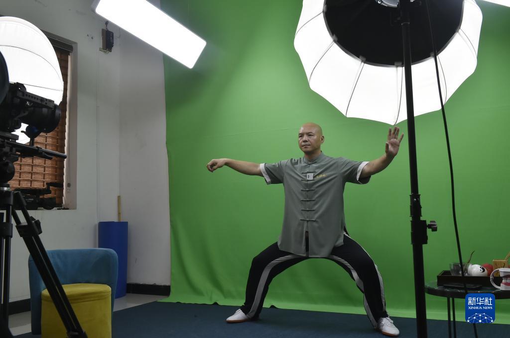 9月15日,太極拳傳人王戰(zhàn)軍在河南溫縣陳家溝自己的武校直播間內(nèi),通過(guò)網(wǎng)絡(luò)直播推廣太極拳。