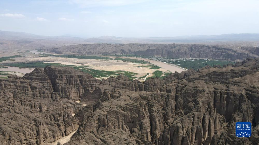 這是黃河岸邊的甘肅省白銀市景泰縣中泉鎮龍灣村和黃河石林景觀(7月11日攝,無人機照片)。