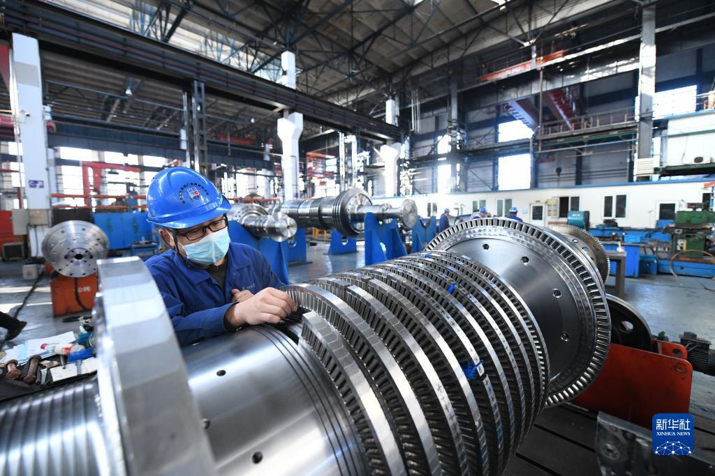 在哈電集團哈爾濱汽輪機廠有限責任公司的生產車間,工人在生產作業(2022年10月27日攝)。