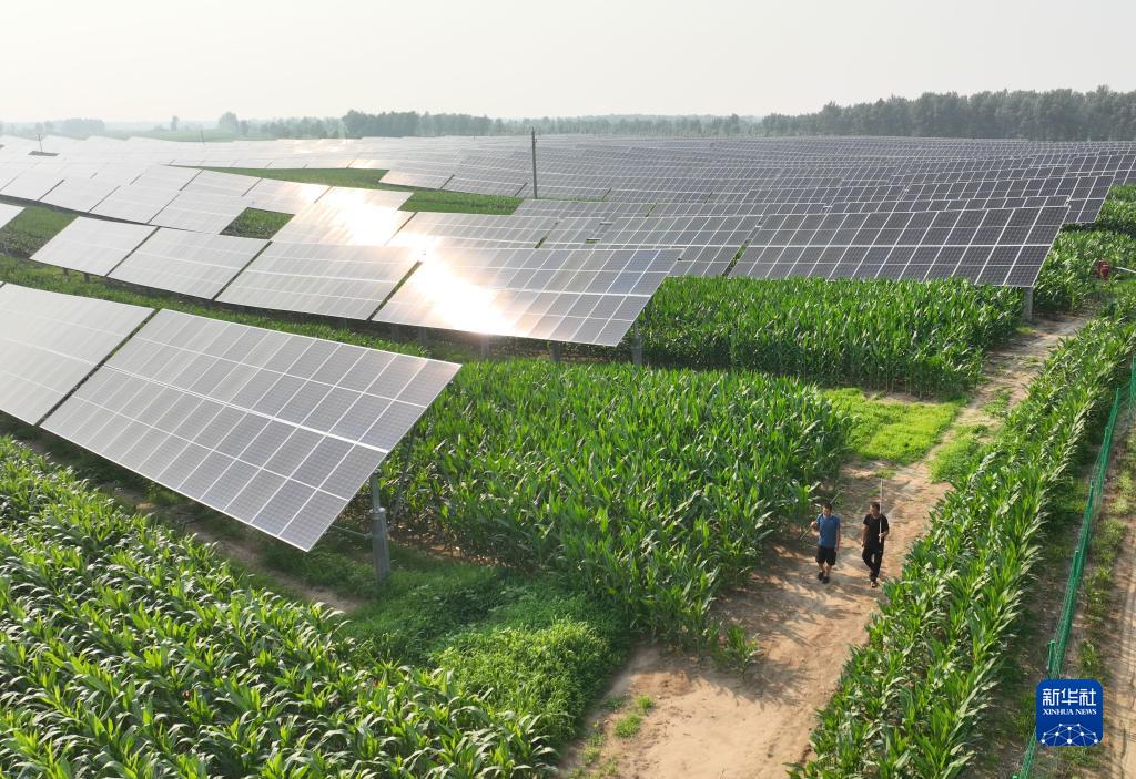 在遼寧省彰武縣馮家鎮(zhèn)哈大冷村,村民經(jīng)過(guò)太陽(yáng)能光伏發(fā)電設(shè)備(7月11日攝,無(wú)人機(jī)照片)。