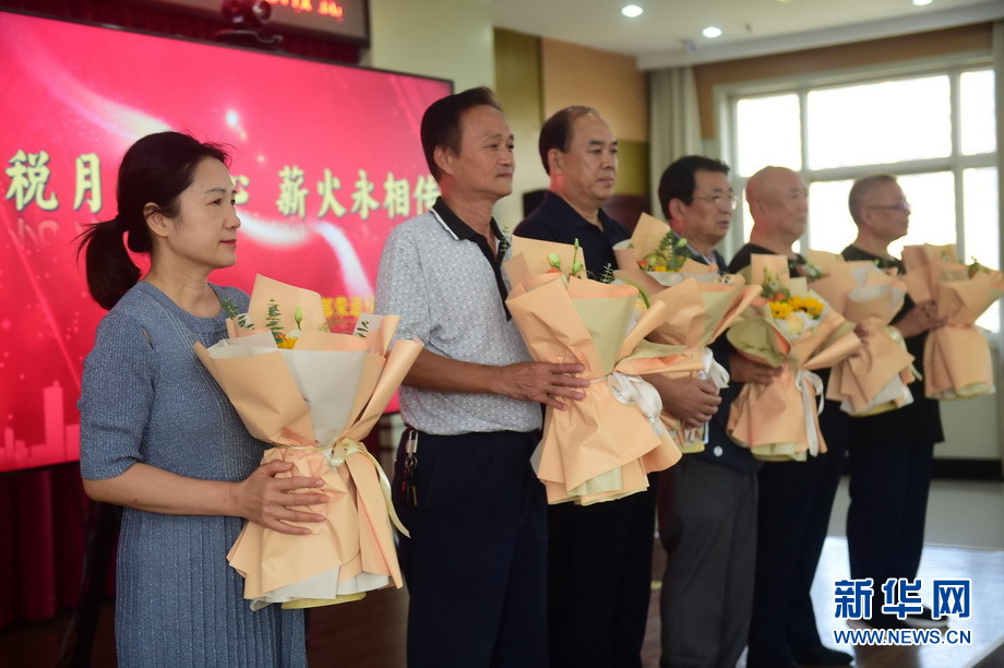 9月15日,國家稅務總局青縣稅務局的年輕稅務干部為退休的老稅官們獻花。新華網發(巴芳 攝)