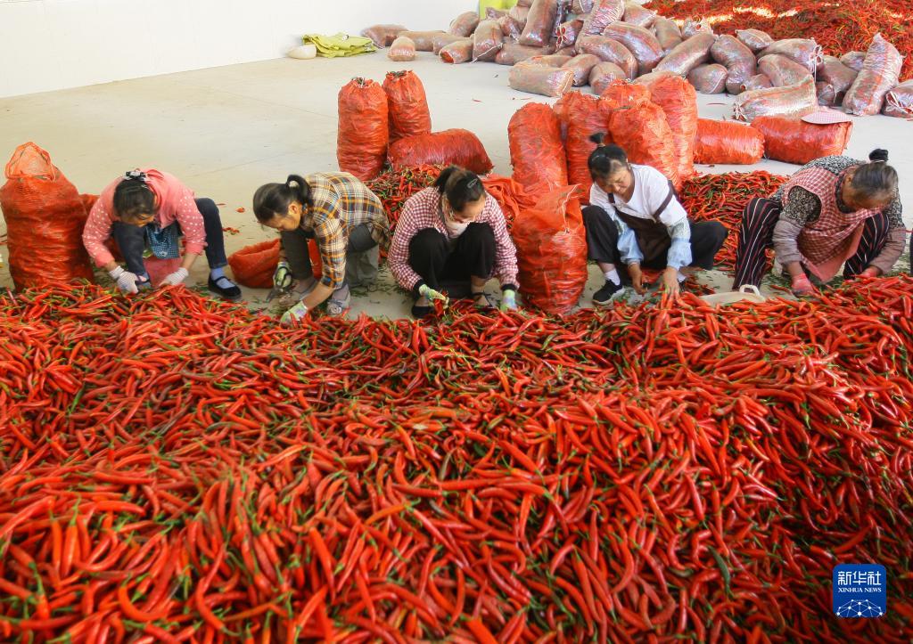 9月17日,在云南省曲靖市沾益區金龍街道新海社區的辣椒收購點,務工人員分揀辣椒。
