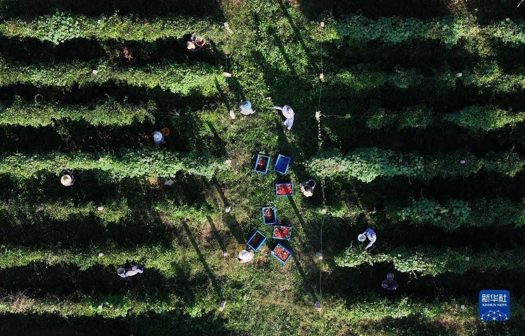 9月18日,唐山市豐潤區(qū)火石營鎮(zhèn)東高莊村的農(nóng)民采摘五味子(無人機照片)。
