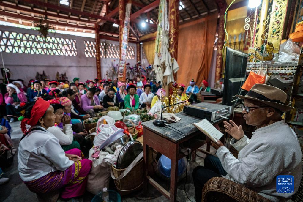 景邁山芒景村文化活動室內,年近八旬的布朗族老人蘇國文(右)在給村民介紹生態和文化保護知識。