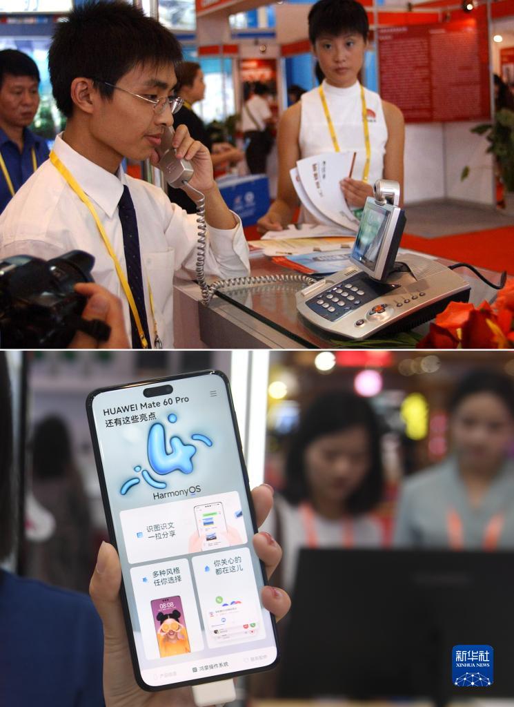 拼版照片:上圖為2005年10月19日,在第2屆中國(guó)—東盟博覽會(huì)上,一名參展商在展示一款電話機(jī)(新華社記者劉廣銘攝);下圖為2023年9月18日,在第20屆中國(guó)—東盟博覽會(huì)上,一名參展工作人員在展示一款手機(jī)(新華社記者陸波岸攝)。