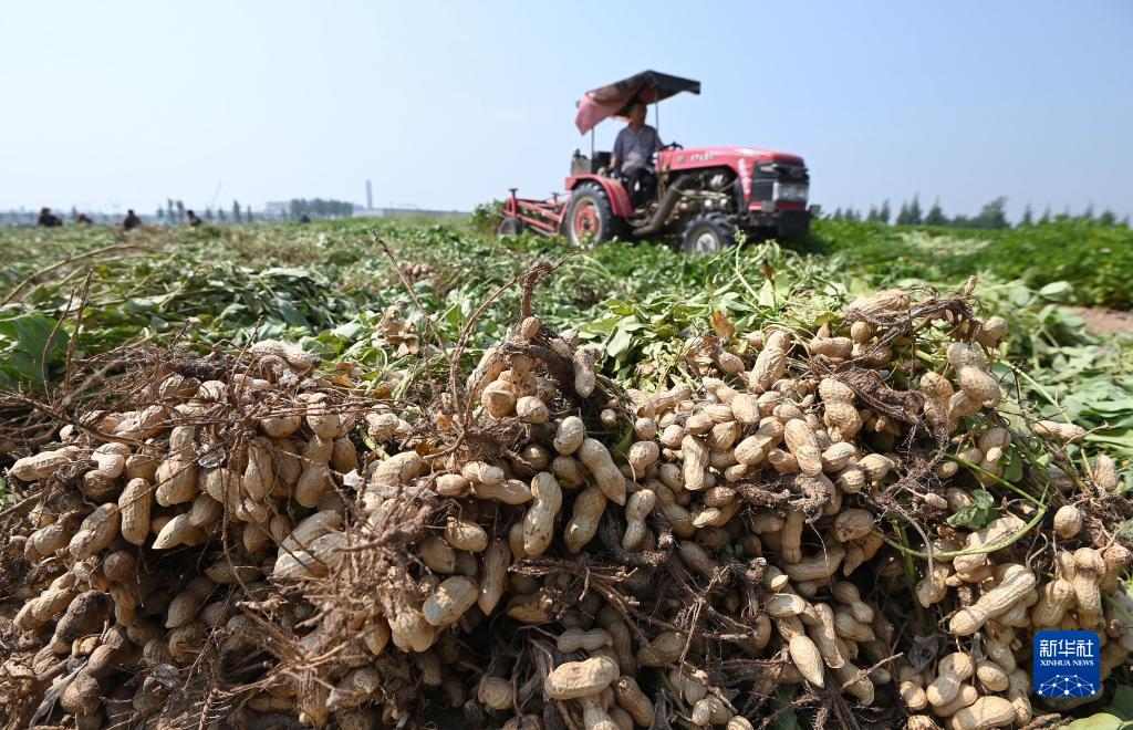 9月18日,在河北省邯鄲市廣平縣東張孟鎮高油酸花生種植基地,農戶使用機械設備收獲花生。