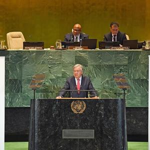 9月18日,在位于紐約的聯合國總部,聯合國秘書長古特雷斯(前)在聯合國可持續發展目標峰會上講話。