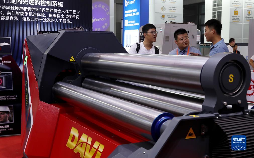 9月19日,參觀者在一個四輥卷板機旁交流討論。