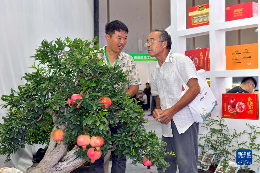 9月19日,在菏澤國際會展中心,工作人員(左)在推介石榴產品。
