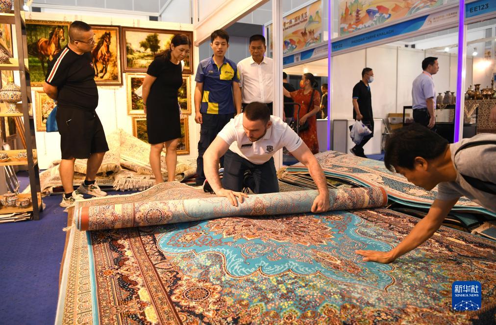 9月19日,觀眾在東博會(huì)現(xiàn)場(chǎng)選購伊朗地毯。