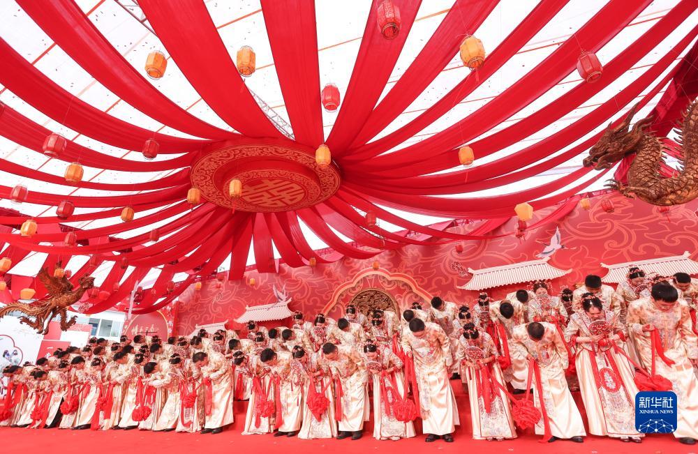 當日,在成達萬(成都經達州至萬州)高速鐵路四川省蓬安縣燕山寨隧道口的施工工地,來自中鐵三局五公司各建設工地的38對新人,身著中國傳統婚禮服飾參加集體婚禮。