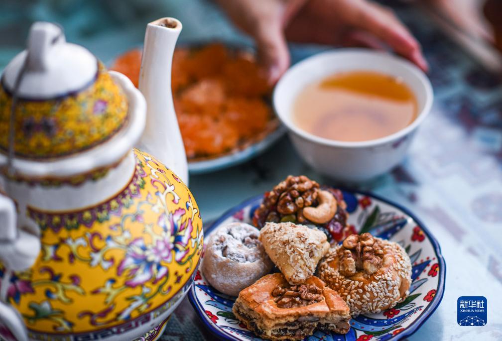 在新疆喀什古城百年老茶館內,茶客在品嘗特色茶飲和茶點(9月15日攝)。