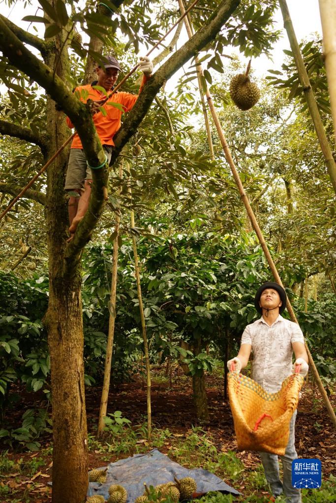 9月15日,在越南多樂省一家榴蓮果園,兩名果農配合采摘榴蓮。